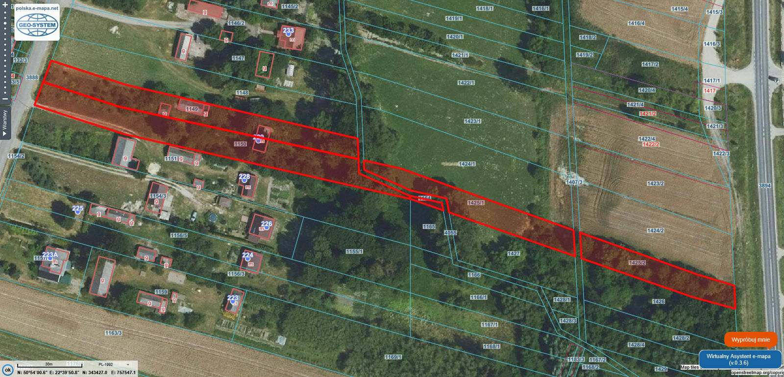 o Działki budowlane (nr 1149, 1150): 37 arów – tu znajduje się dom i zabudowania.